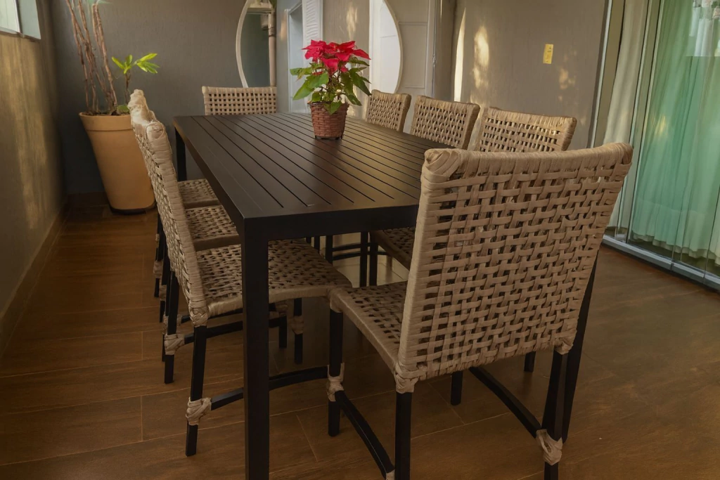 Transforme seu ambiente com o Conjunto de 8 cadeiras e mesa ripada de alumínio 1,40 mts, uma peça que une design moderno, conforto e resistência.